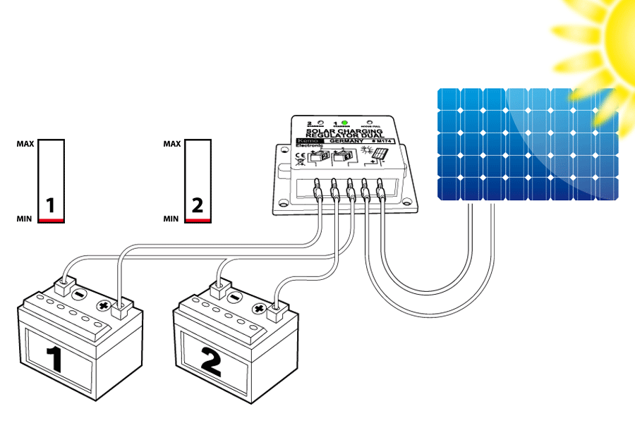 Max. Charging current: 16A total (2 accumulators each with max. 8A or 1 accumulator which is parallel-connected to both outputs up to 16A)